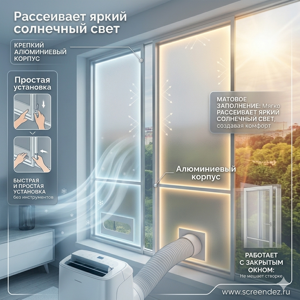 Вставка с матовым наполнением от DEZ — это продуманное решение для помещений с окнами на солнечной стороне. Она не только упрощает использование мобильного кондиционера, но и создаёт комфортную световую среду, защищает от жары и обеспечивает приватность.